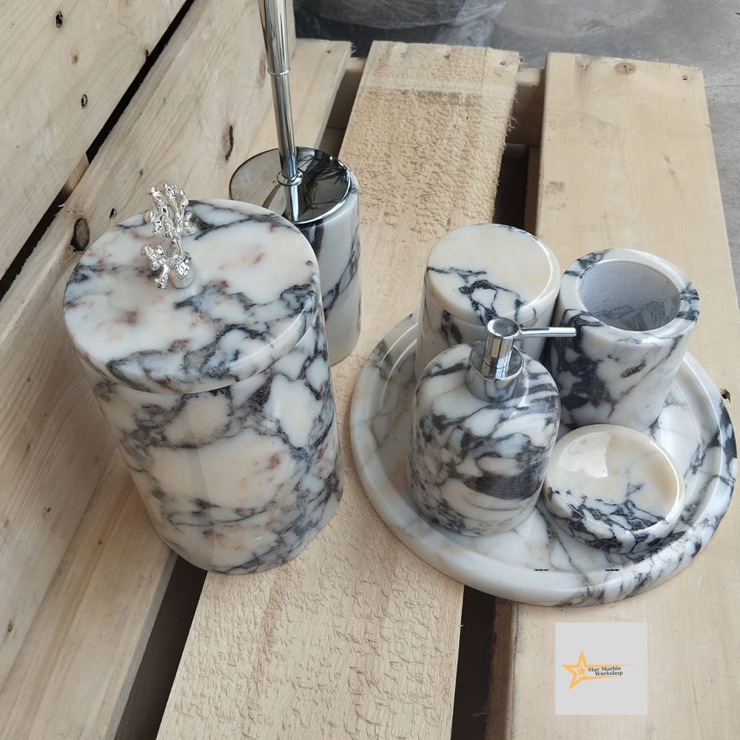 - Calacatta Marble 7-Piece Bathroom Set includes; It consists of 1 marble tray + 1 marble soap dispenser + 1 marble liquid soap dispenser + 1 marble toothbrush holder + 1 marble cotton bowl with a lid + 1 marble trash can with cover + 1 marble toilet bowl brush holder.